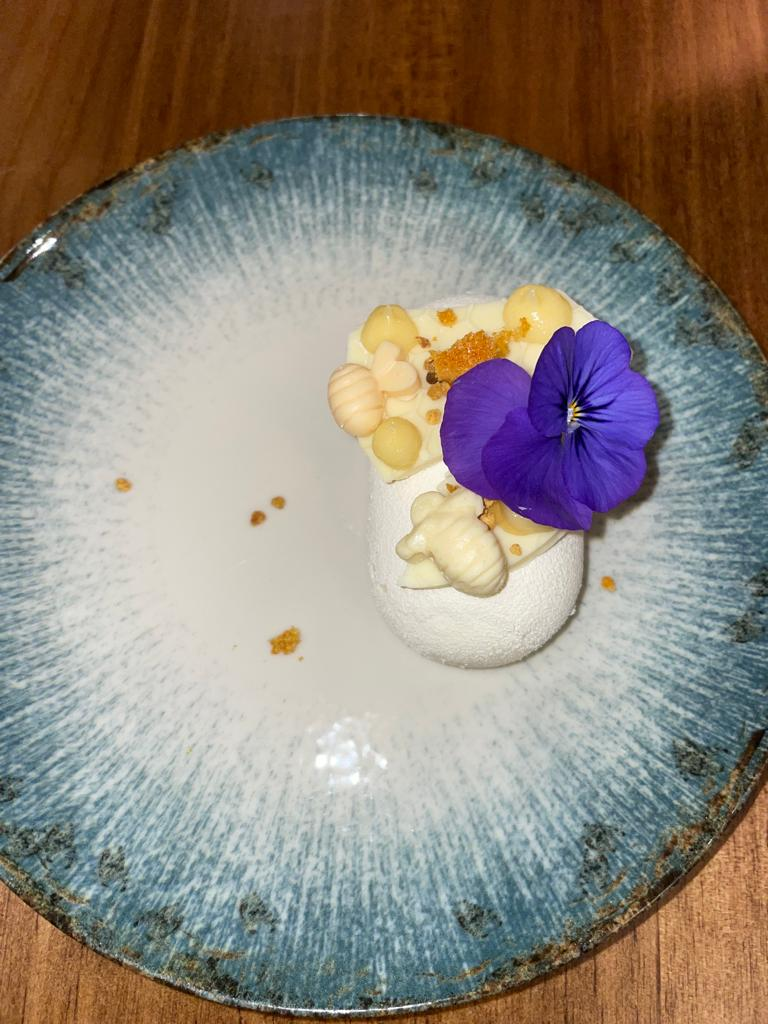 Mousse de yogurt con miel, chocolate blanco y crema de limón.