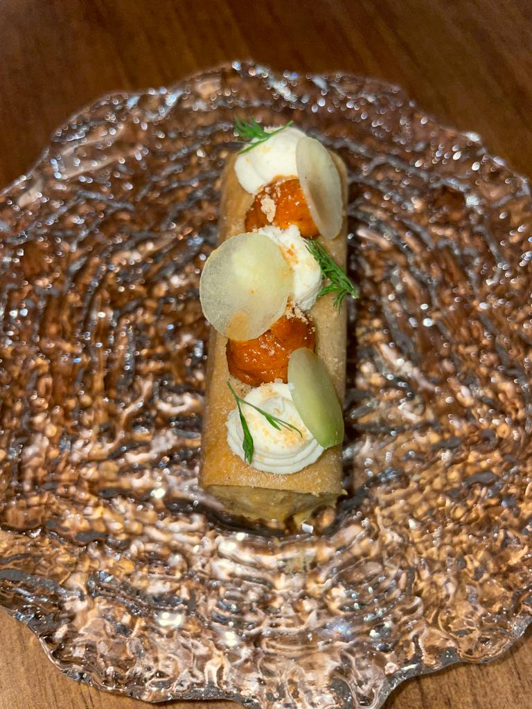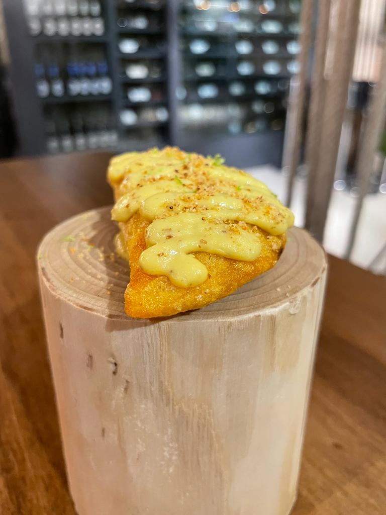 Empanada de maíz rellena de moraga de sardinas con crema de maíz dulce, kikos triturados con tahin y lima.