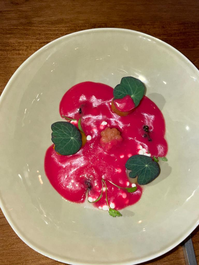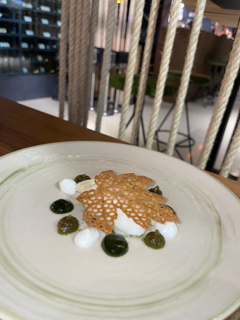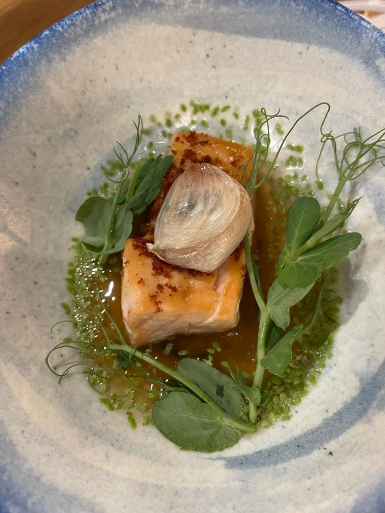 Séptima📸-.Salmón con caldo de jamón 5 Jotas, ajocaviar y brotes de guisantes (Sollo).