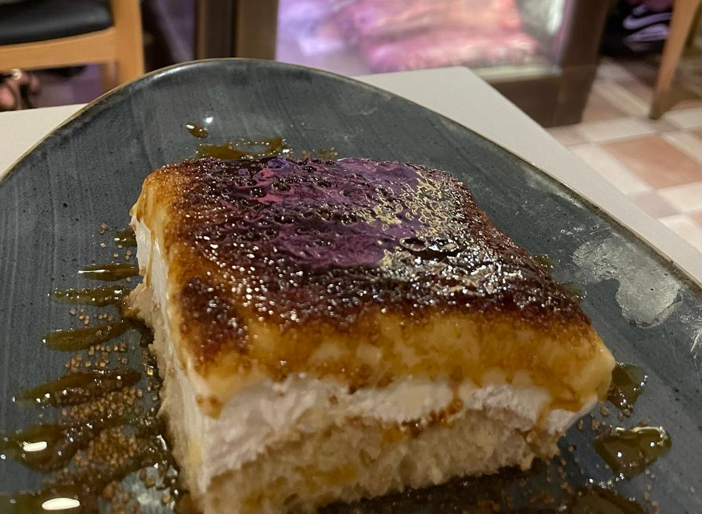 Sexta📸-. Tarta Gotxua o vasca: bizcocho embebido en ron, nata, queso, crema pastelera y azúcar flambeada en mesa (6,5€).