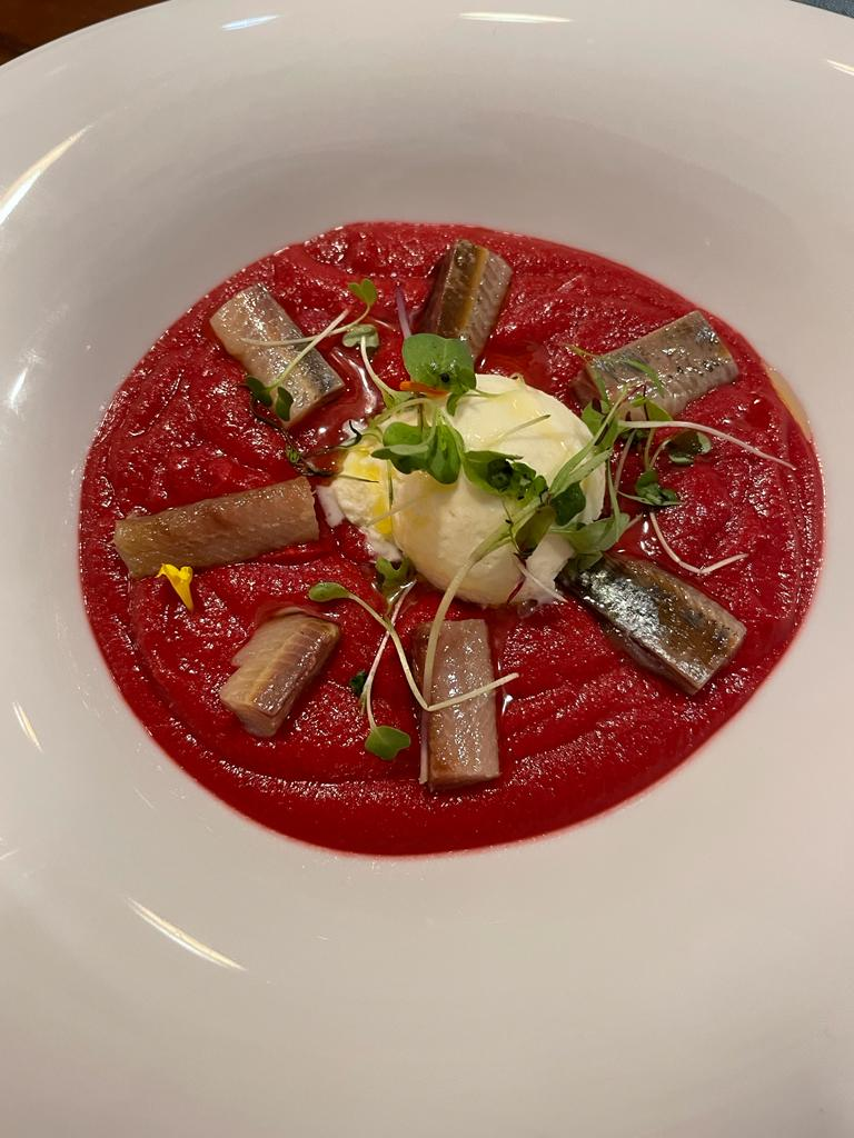 Sexta 📸-. Porra de tomate y remolacha, helado de queso idiazábal y sardina ahumada (11,5€).