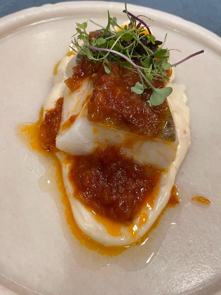 Tercera 📸-. Bacalao confitado, crema coliflor, tomate y albahaca (media: 12€; ración: 19€).