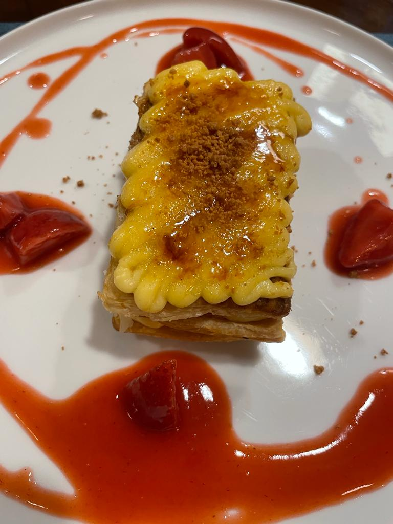 Séptima 📸-. Milhojas rellenas de crema de pastelera y fresas (6€).