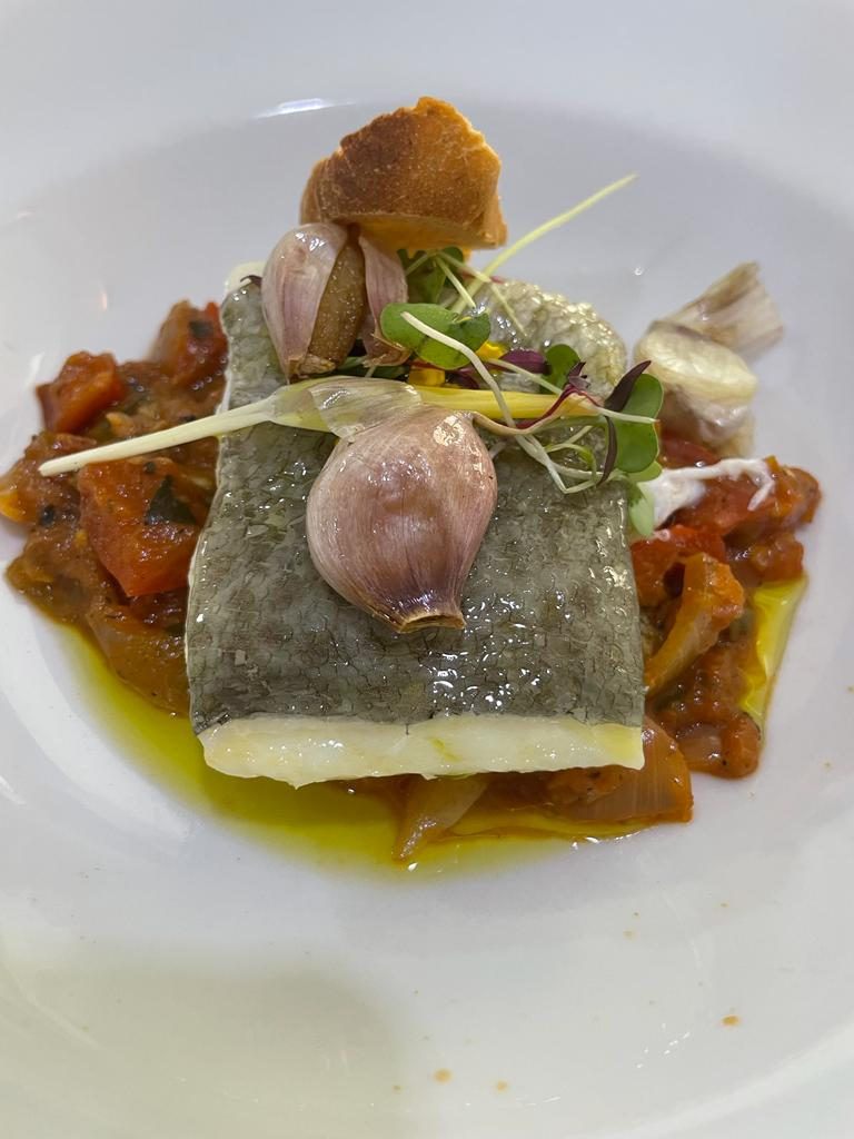 Quinta 📸-. Lomo de Bacalao confitado sobre pisto fino de calabaza (19€).