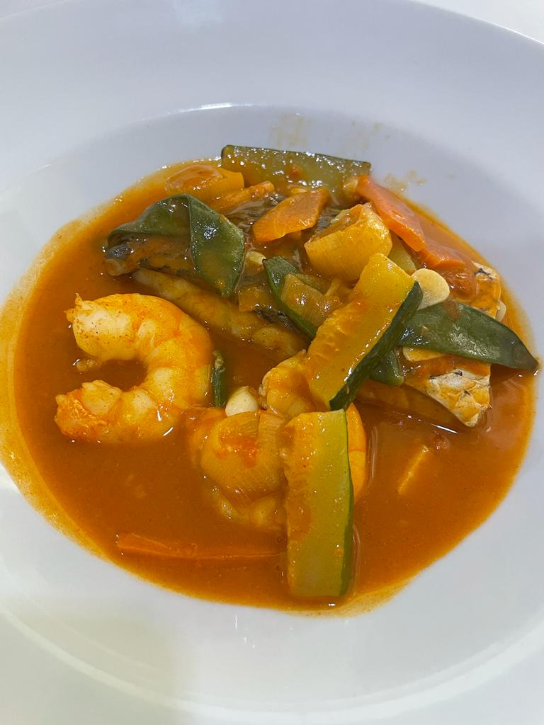 Sexta 📸-. Corvina con vino blanco, su berza de langostinos y verduras (19€).