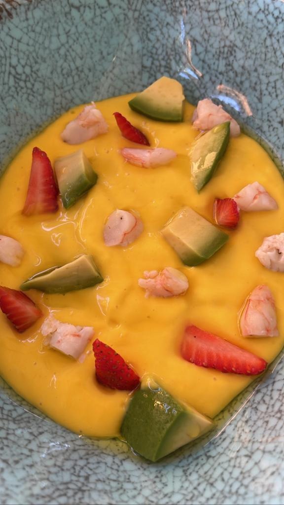 Quinta 📸-. Porra de mango, gamba blanca y aguacate (9€).