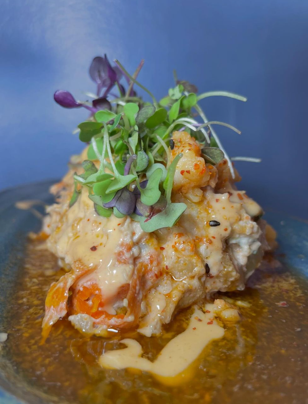 Primera y Segunda 📸-. Tapa de ensaladilla rusa con toque japo acompañada de langostinos al pil-pil (8€).