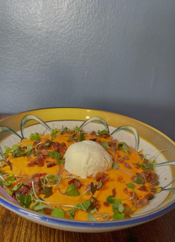 Tercera y Cuarta 📸-. Salmorejo de tomate cherry con helado de mascarpone y virutas de jamón tostado (10€).