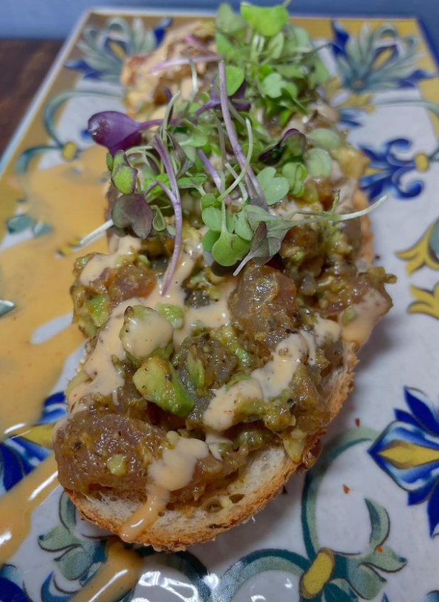 Sexta 📸-. Tosta de atún rojo con tomate seco, aguacate y trufa (8,5€).