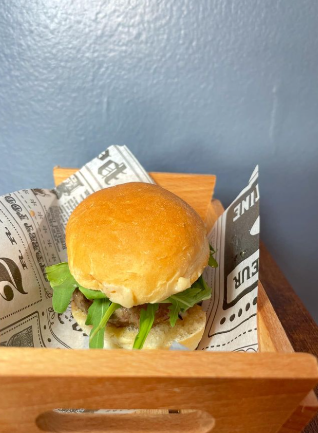 Séptima 📸-. Mini burger black angus con rúcula y mahonesa de de ajo asado (3,9€).