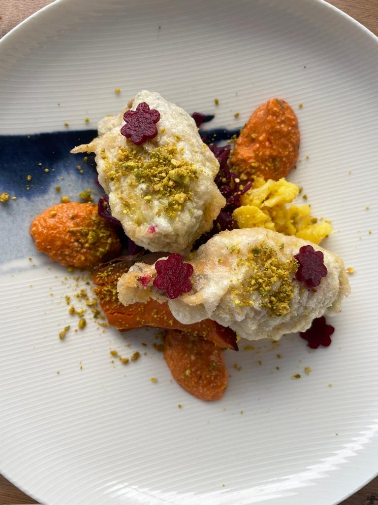 Flores de calabacín en tempura rellenas con queso de cabra Sabra María del Cerro, salsa romesco y verduras escabechadas (18€).