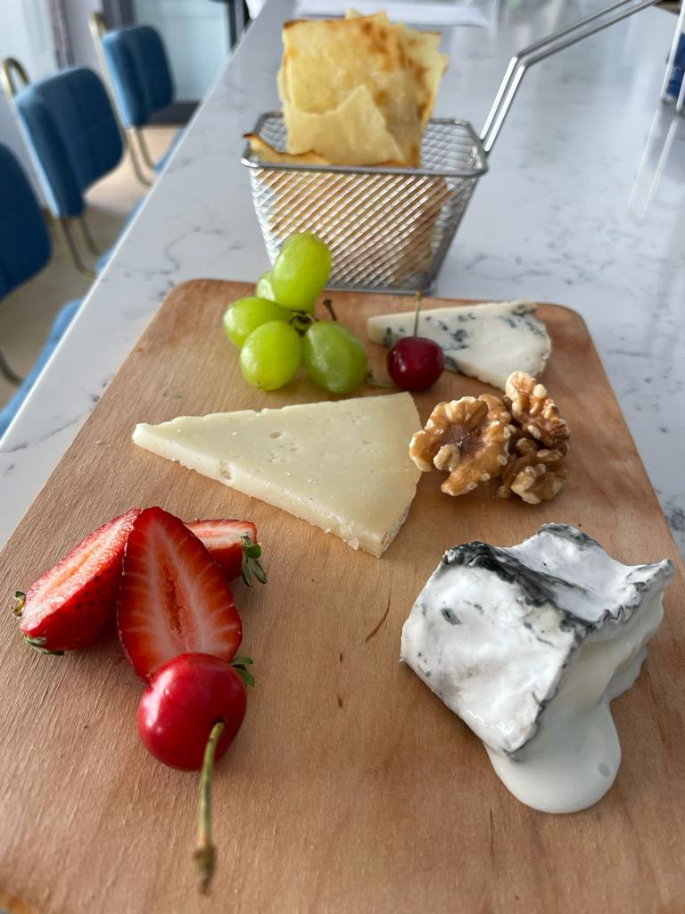 Tabla de quesos artesanales: Queso al carbón estilo brie, manchego y queso andaluz (4,5€).