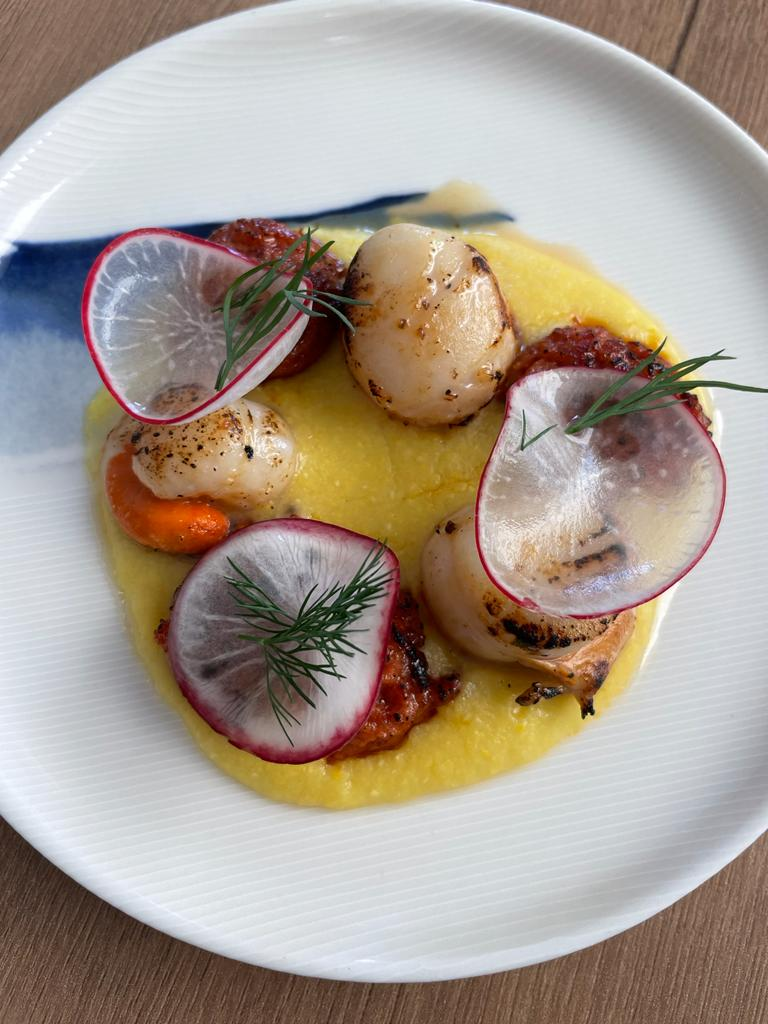 Vieiras a la parrilla, chorizo y maíz tostado (6,5€).