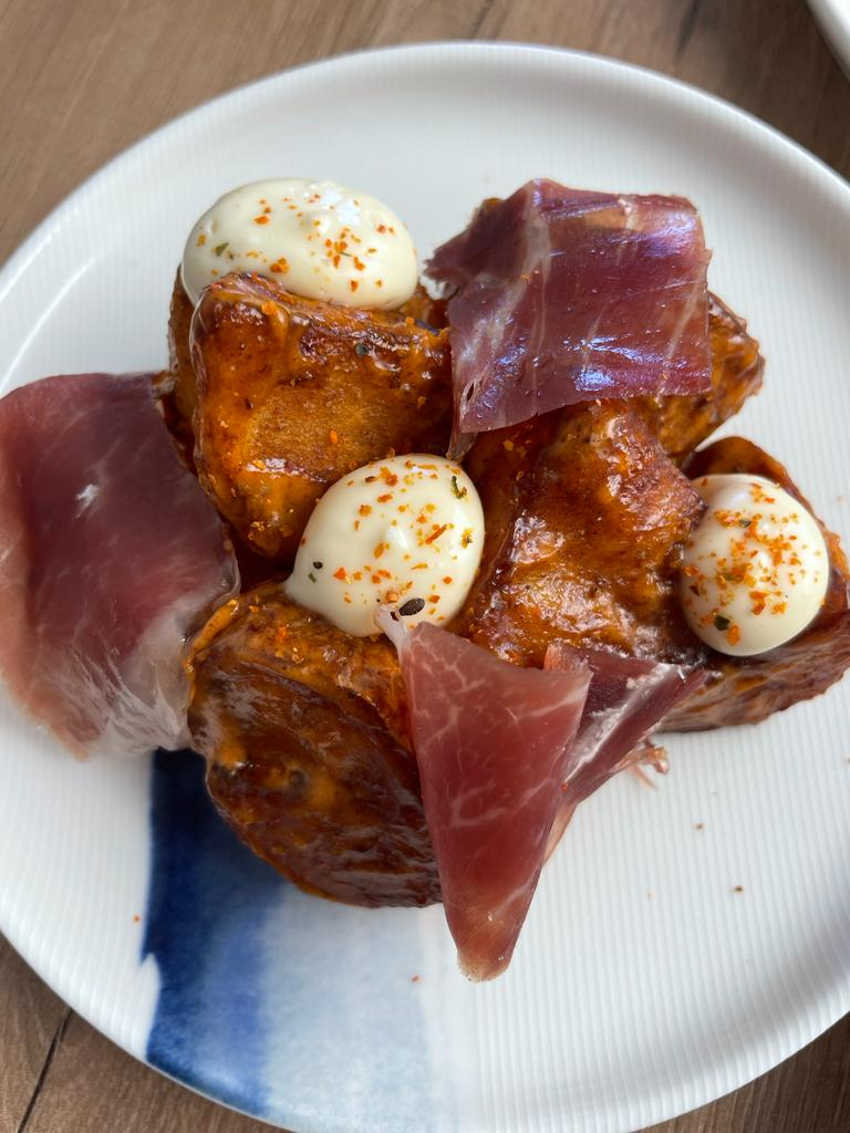 Patatas bravas, jamón ibérico, alioli y salsa brava (7€);