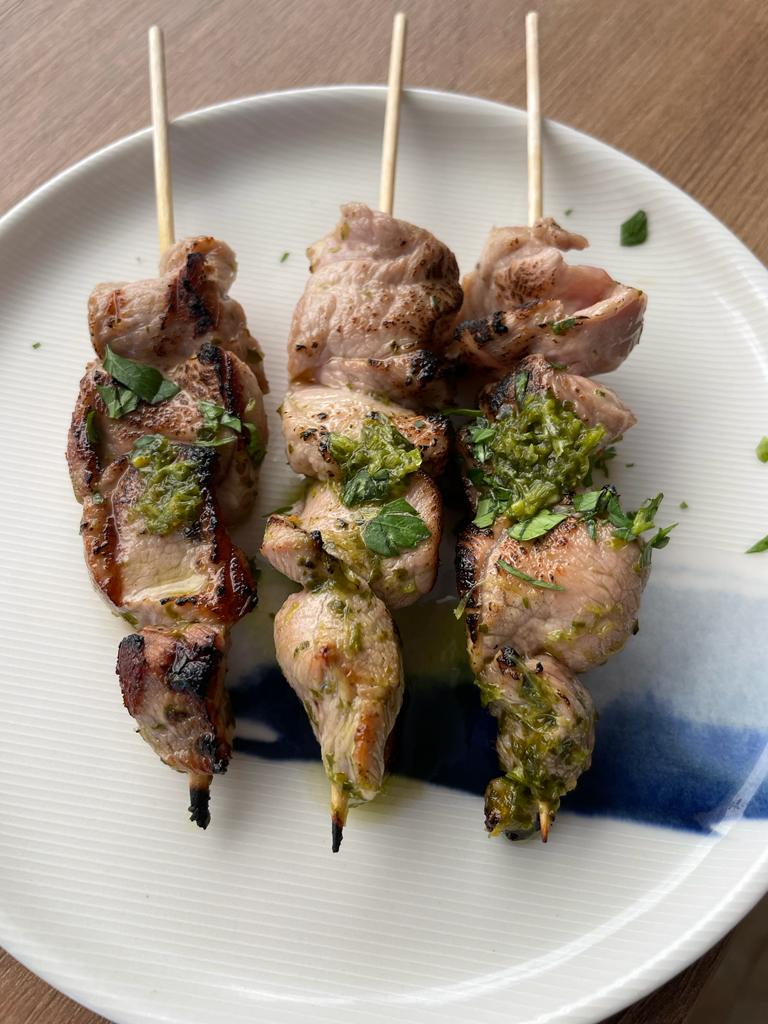 Brochetas de cordero a la parrilla con salsa chimichurri (6€).