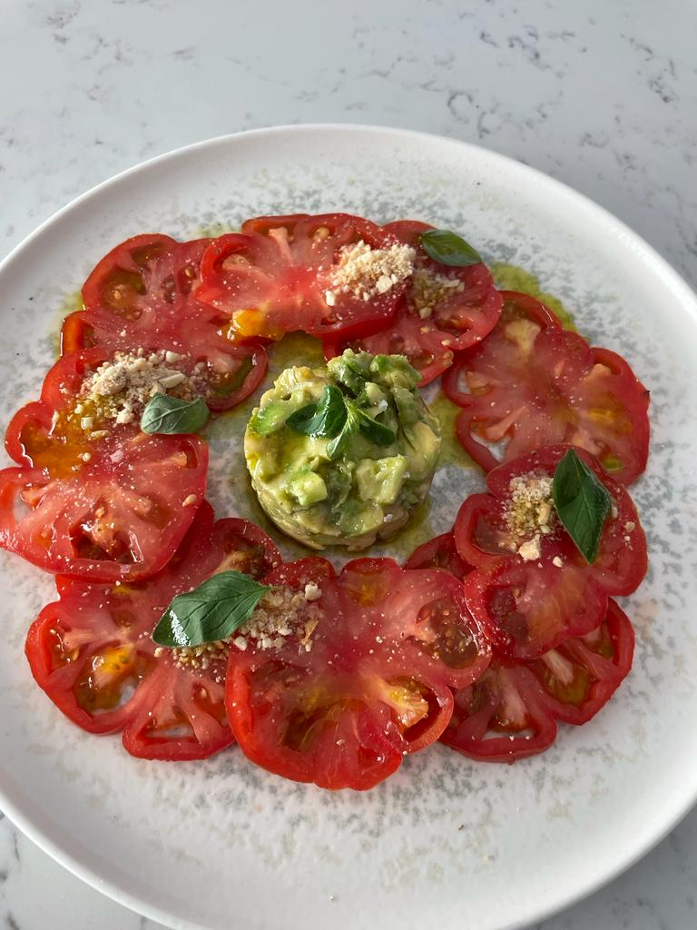 Carpaccio de tomate con aguacate, almendras ahumadas, orégano fresco y AOVE (12€).