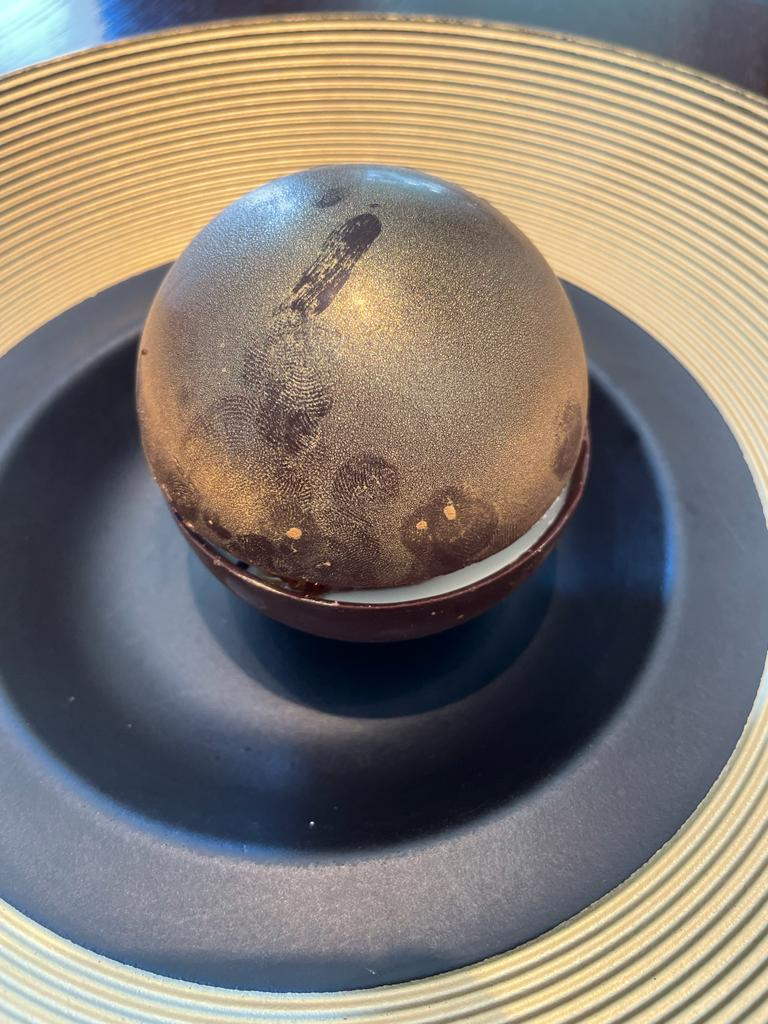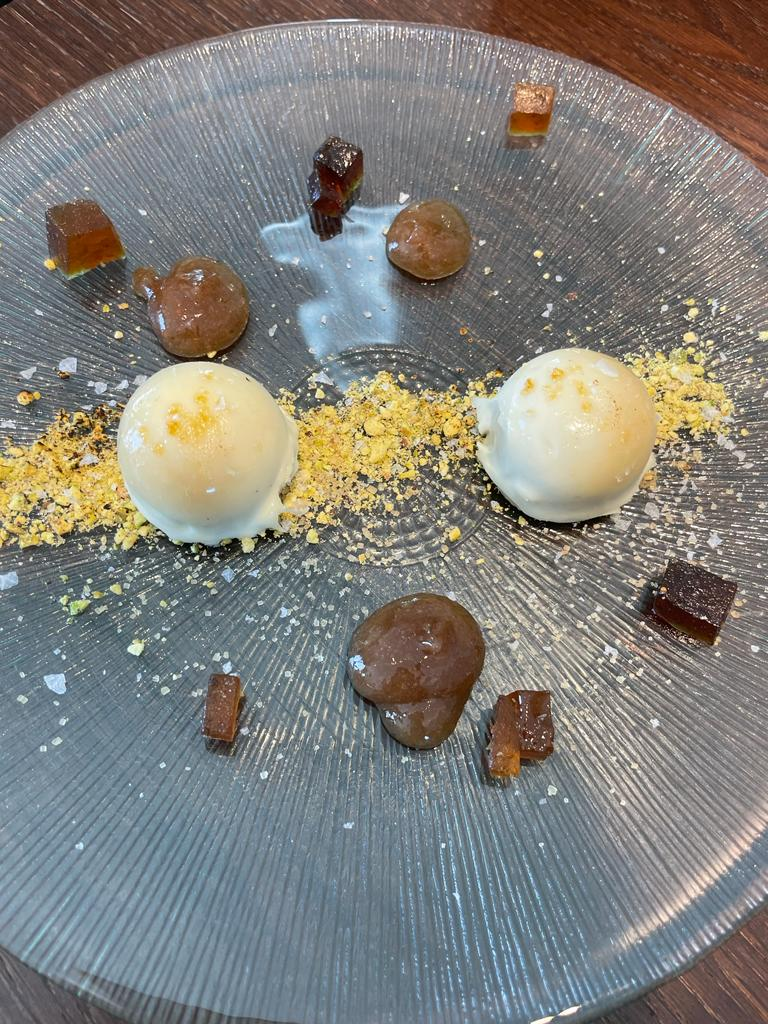 Sexta y séptima 📸-. Esférico de chocolate relleno de torrija al aroma de azahar, helado de turrón, PX y chocolate caliente (7€).