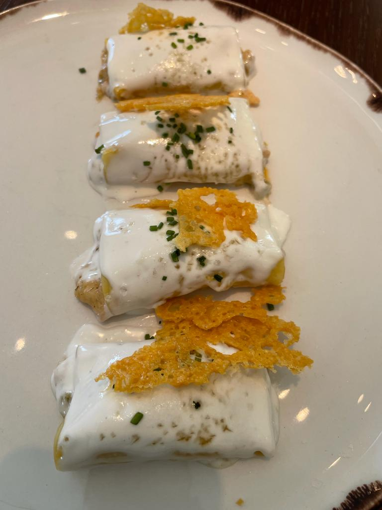 Segunda 📸-. Canelón de salmón y espárragos trigueros gratinados con alioli suave (tapa: 7,5€; ración: 14€).