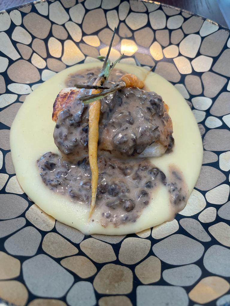Tercera 📸-. Merluza de pincho a la brasa, vichiçoise, champiñones a la crema y zanahorias baby (14€).