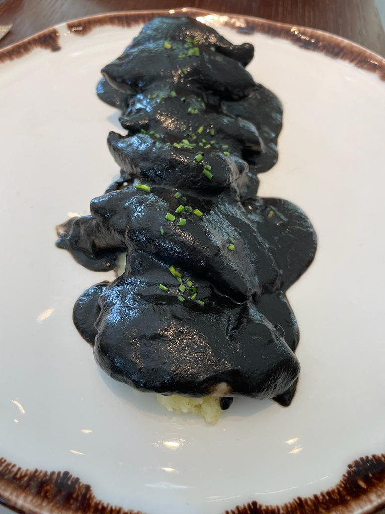Quinta 📸-. Chipirones en su tinta rellenos de carne de centollo y langostinos (tapa: 7€; ración: 14€).