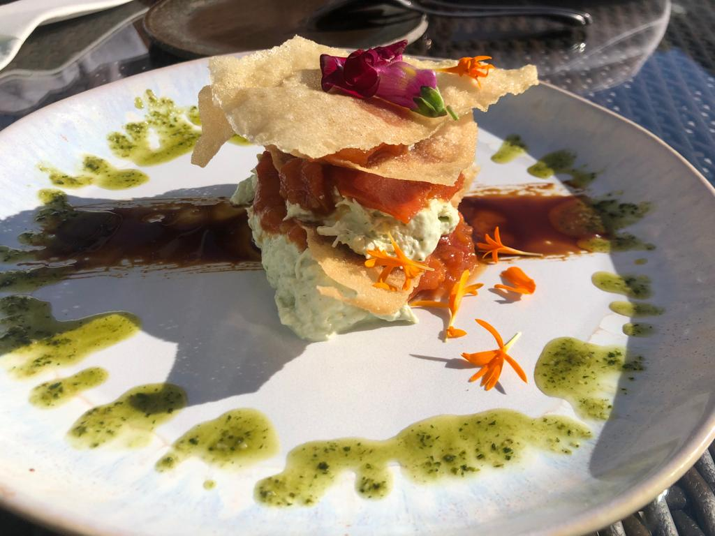 Segunda 📸-. Milhoja de burrata emulsionada en pesto acompañadas de confitura de tomate y aceite de albahaca.