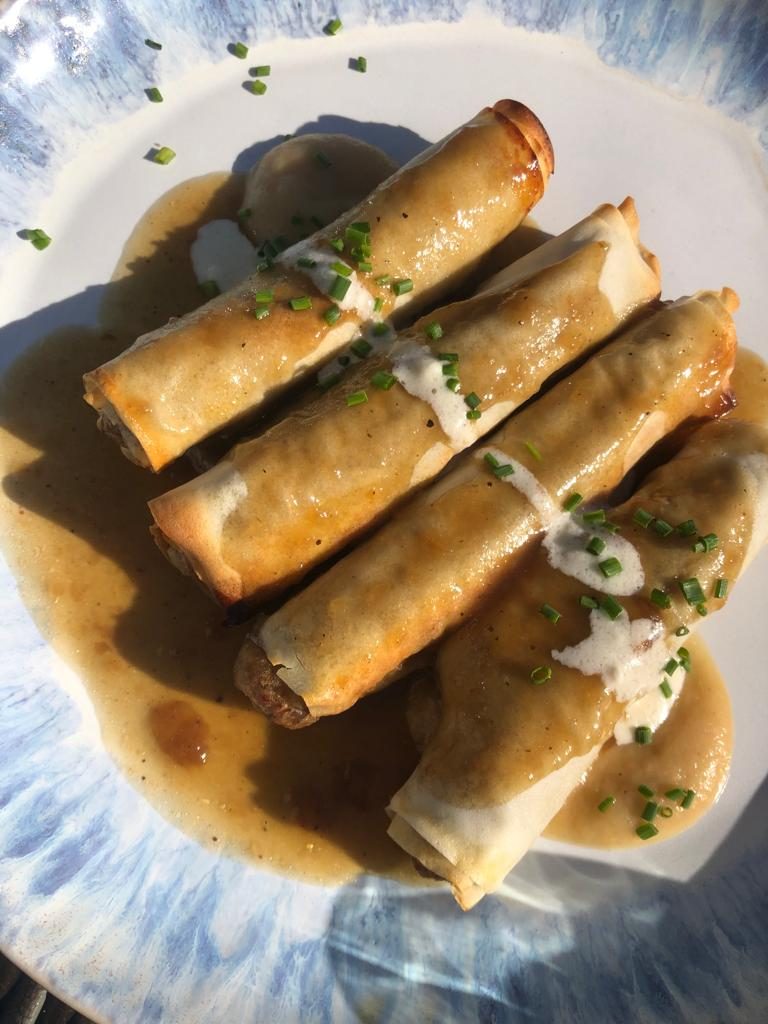 Primera 📸-. Canelones de carrillera ibérica (carrillera de bellota de 65 grados, calabaza confitada, espuma de hinojo y jugo de su cocción).