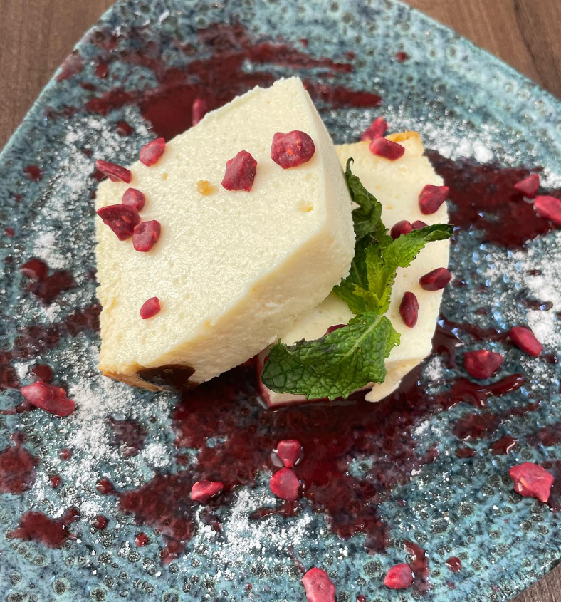 Séptima 📸-. Tarta de queso de sake fermentado crujiente frambuesa y salsa de frutos rojos (7€).