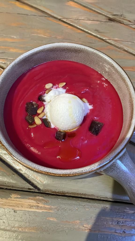 Segunda 📸-. Porra de remolacha, helado de queso y mojama (6€).