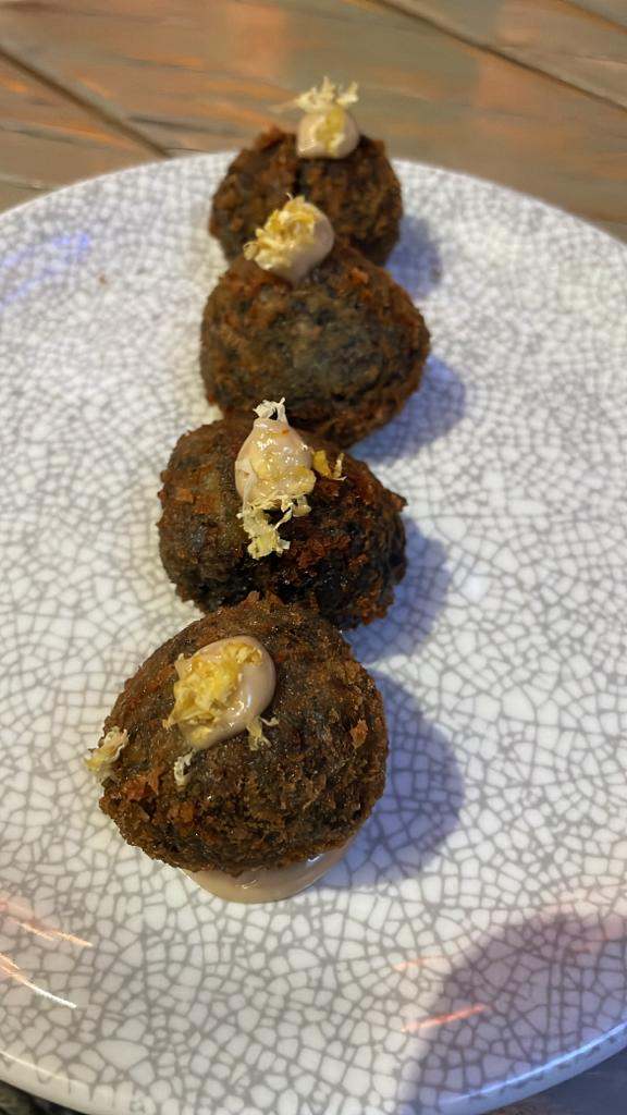 Tercera 📸-. Croquetas de kraken en su tinta (4 unidades 4,5€).
