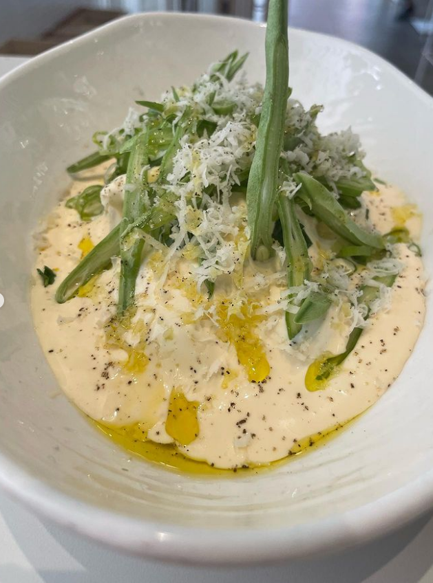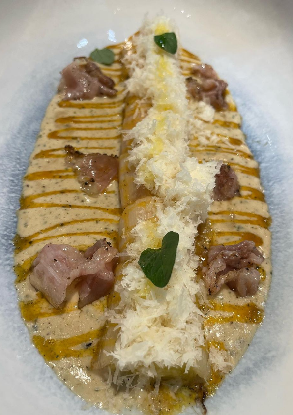Segunda 📸-.Puerro a la carbonara, yema curada y nube de parmesano (12€).