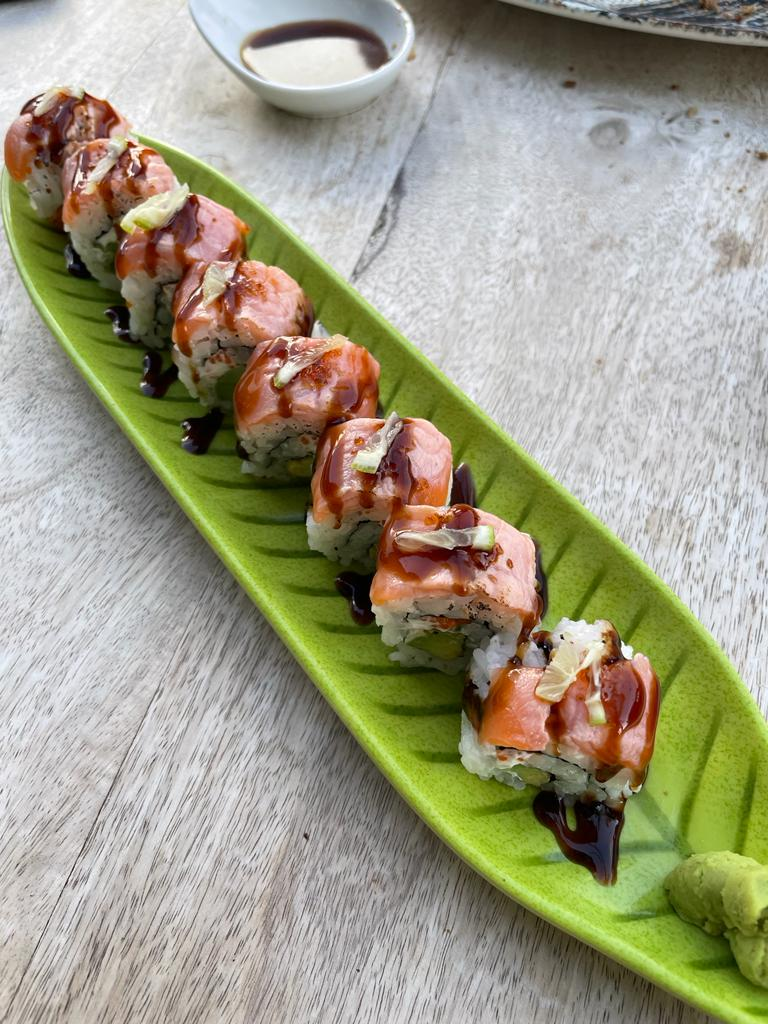 Tercera 📸-. Uramaki aburi de queso crema, aguacate, tobiko, cubierto de salmón aburi, lima y teriyaki (14,50€).