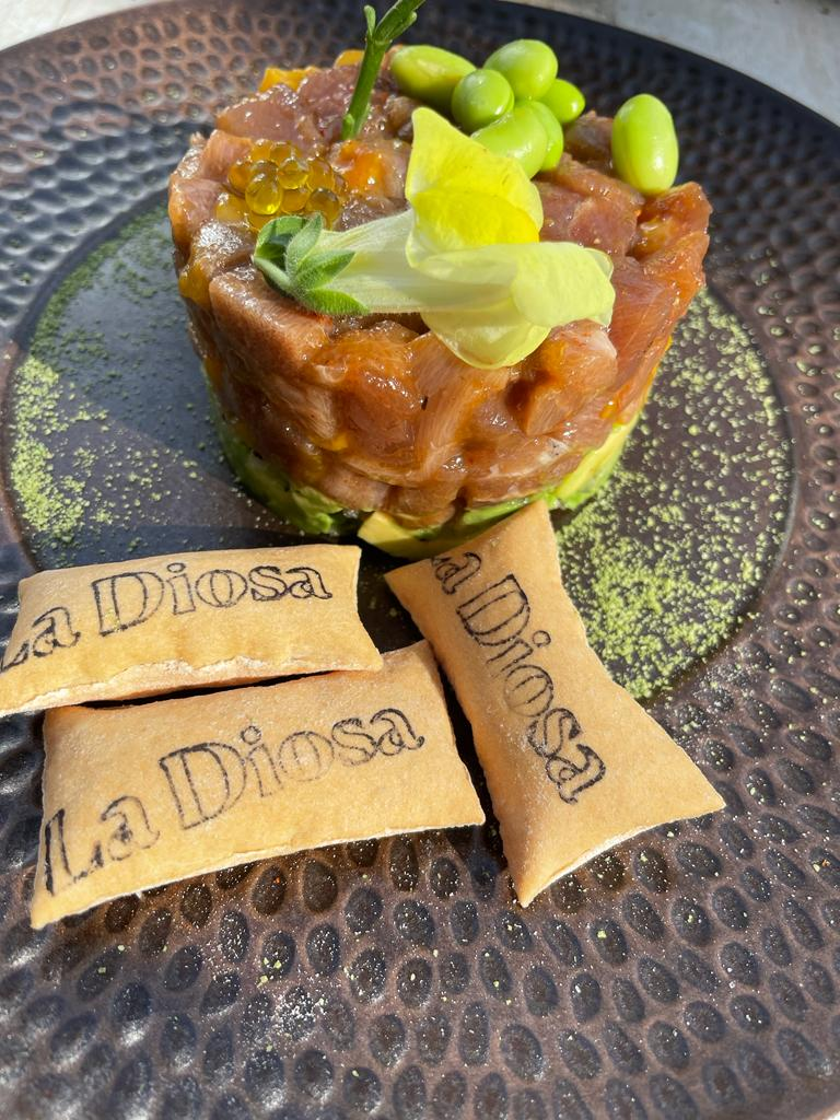 Primera 📸-. Tartar de atún rojo trufado con esferificación inversa (14,00€).