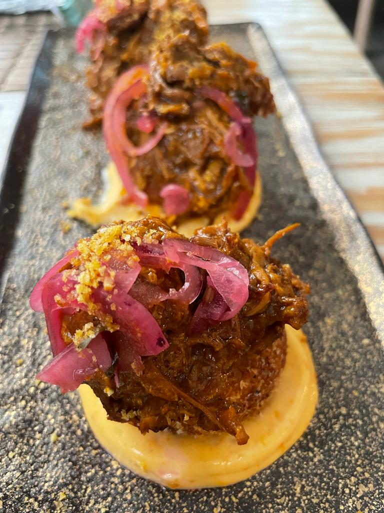 Primera📸-. Causa rebozada con cochinita pipil (tapa 4€ de 1 unidad; ración 11€ 3).