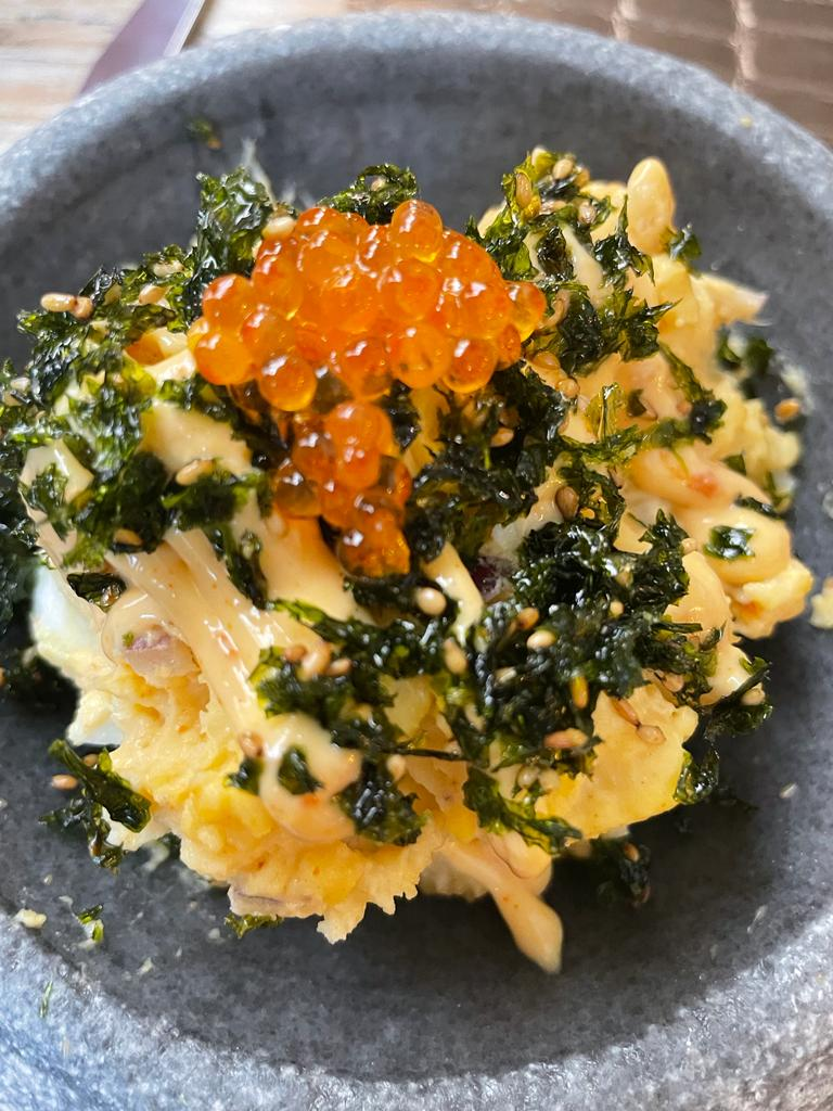 Tercera 📸-. Ensaladilla rusa con gambas pilpil y huevas de pez volador (tapa 4€ y ración 9€).