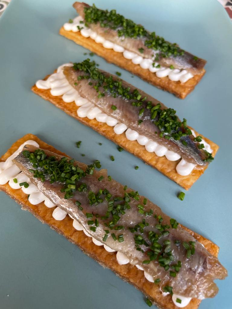 Primera 📸-. Hojaldre, sardina ahumada y queso payoyo (3,5€/ud).