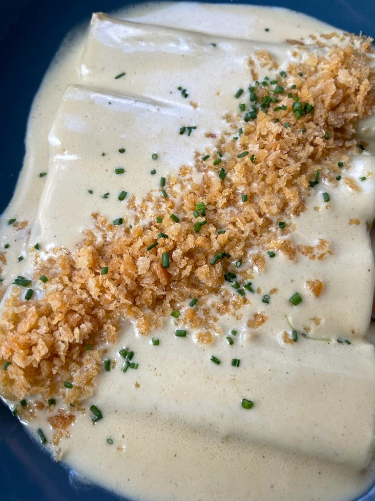 Segunda 📸-. Canelones de pollo del corral y salsa foie (14€).