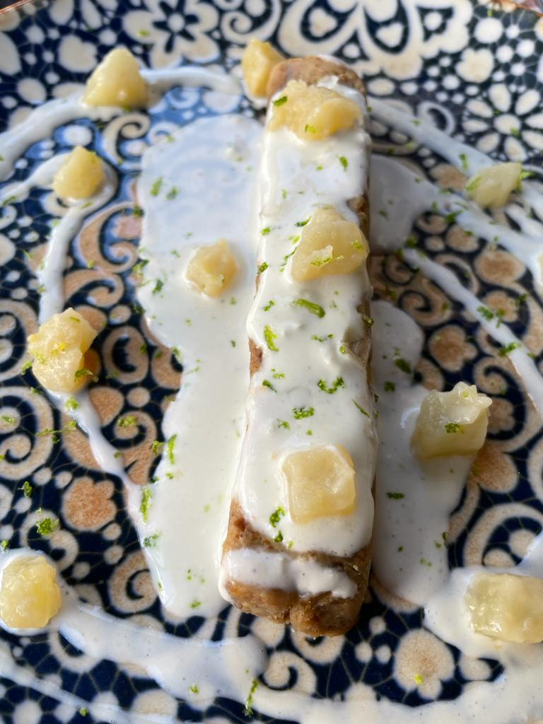 Tercera 📸-. Turrón de foie, peras, yogurt de naranja y ralladura de lima (12€).