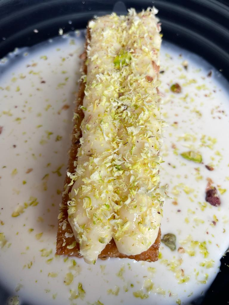 Quinta 📸-. Milhoja de chocolate blanco, sopa de queso y pistacho rallado (6€).