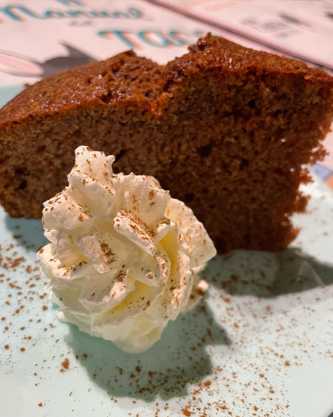 Sexta📸-.Bizcocho de plátano, chocolate, canela y nata montada(4,2€).