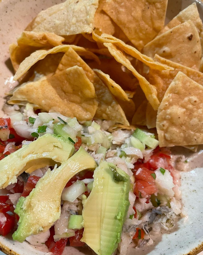 Quinta📸-.Ceviche de pescado: merluza cocinada, marinada con limón, AOVE, pepino, cebolla, tomate, aguacate y totopos(8€).