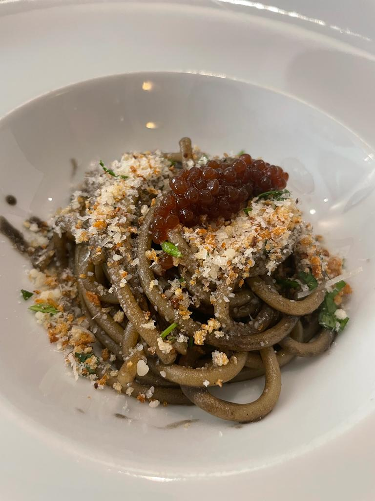 Segunda 📸-. Spaguetti “aglio nero, olio e peperoncino y esferas de anchoas” (15€).