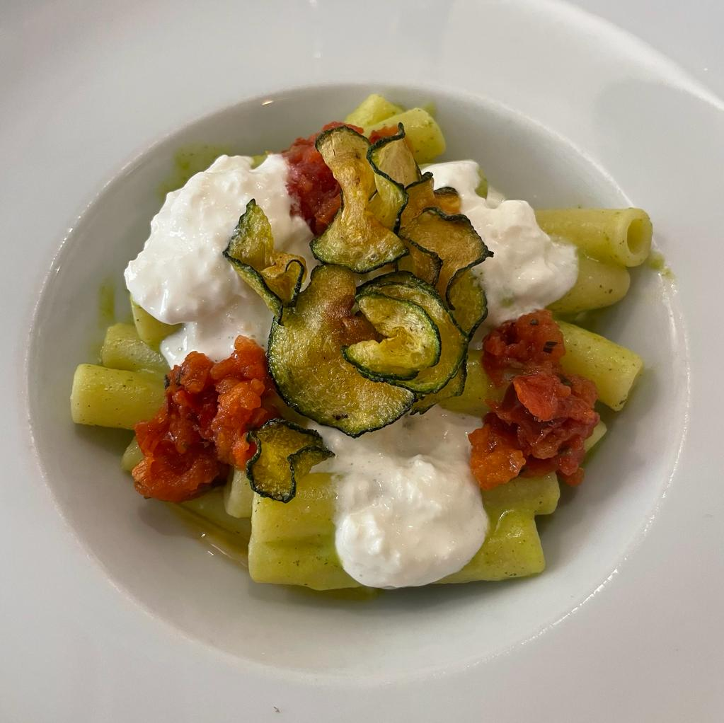 Tercera 📸-. Macarrone crema de calabacín, albahaca con burrata, tomate seco y calabacín frito (15€).