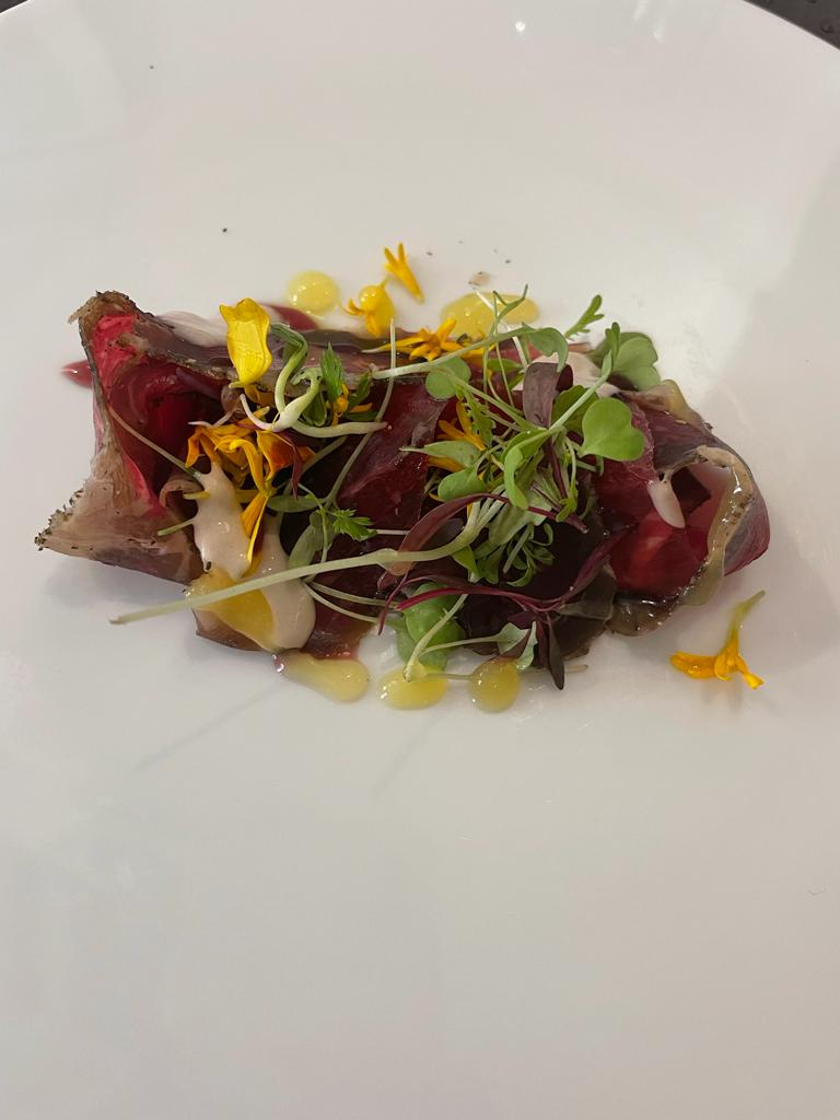 Cuarta 📸-. Presa de ternera marinada, vino tinto, mayonesa de atún, gel de limón y polvo de alcaparra (14€).