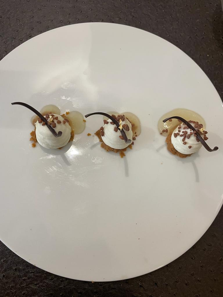 Quinta 📸-. Crema de ricotta, base de galletas, petazetas, chocolate, oro y mermelada de pera (6€).