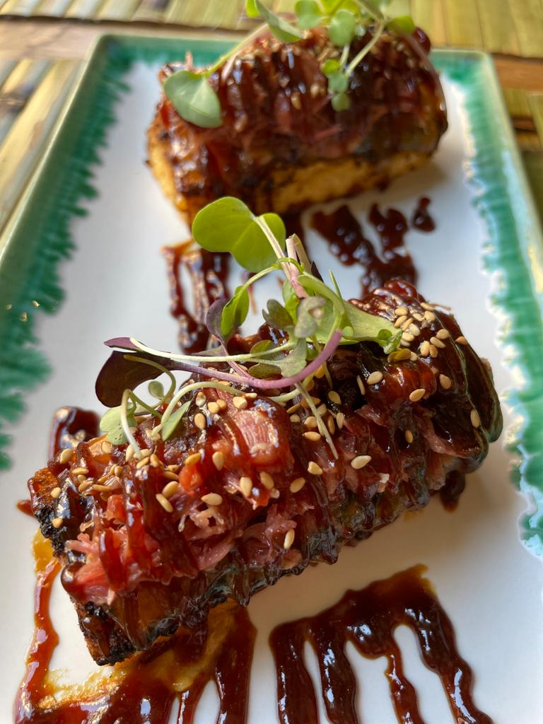Primera 📸-. Pan de leche con mermelada de ciruelas y pato confitado (9€).