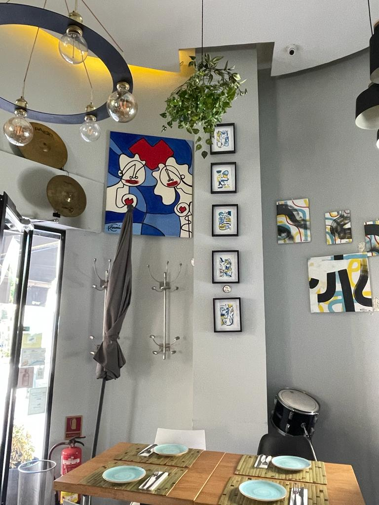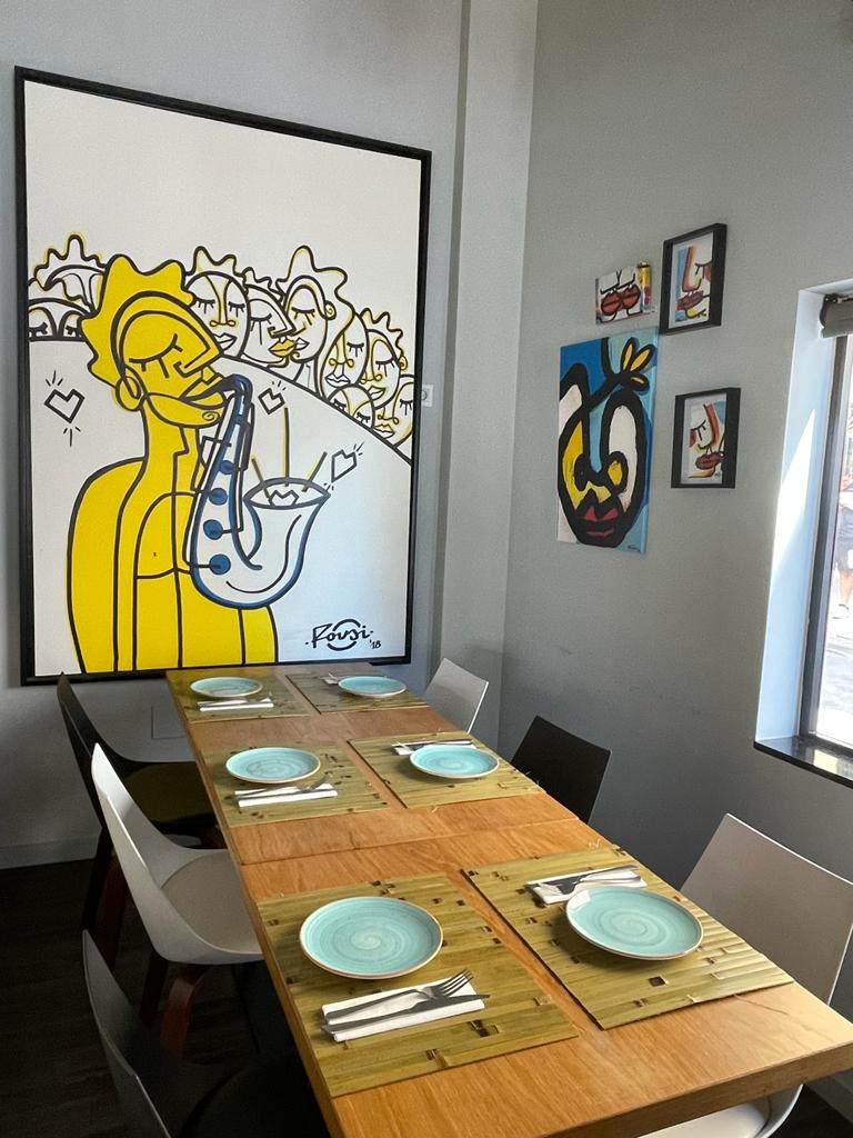 👍🏻 personalización del espacio mediante una decoración original y modernista que enlaza el arte y la gastronomía. La autora de los cuadros que lucen en el restaurante es @rousi.art y los podéis adquirir allí mismo.