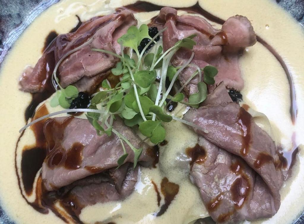 Tercera 📸-. Raviolis de rabo de toro con salsa de foie, lascas de roast beef, brotes de rúcula y huevas de lumpu.