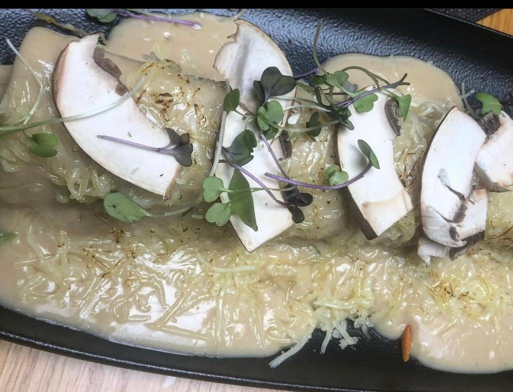 Cuarta 📸-. Canelón de chivo malagueño gratinado con portobello laminado y su jugo trufado.