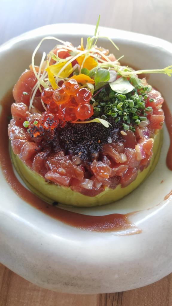 Primera 📸-. Tartar de atún con frambuesa y aguacate de la axarquía (14,9€).