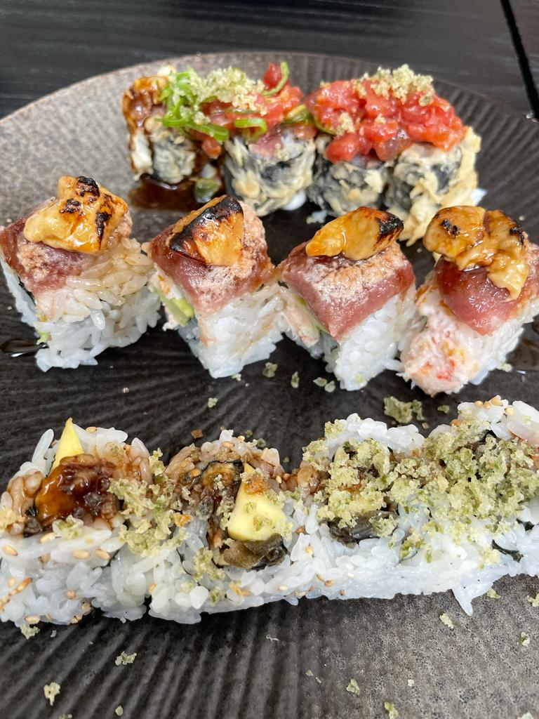 -Uramaki “toro foie”: cangrejo, aguacate, cubierto de ventresca de atún flambeada y PX (9,25€/4 uds).